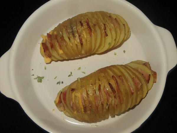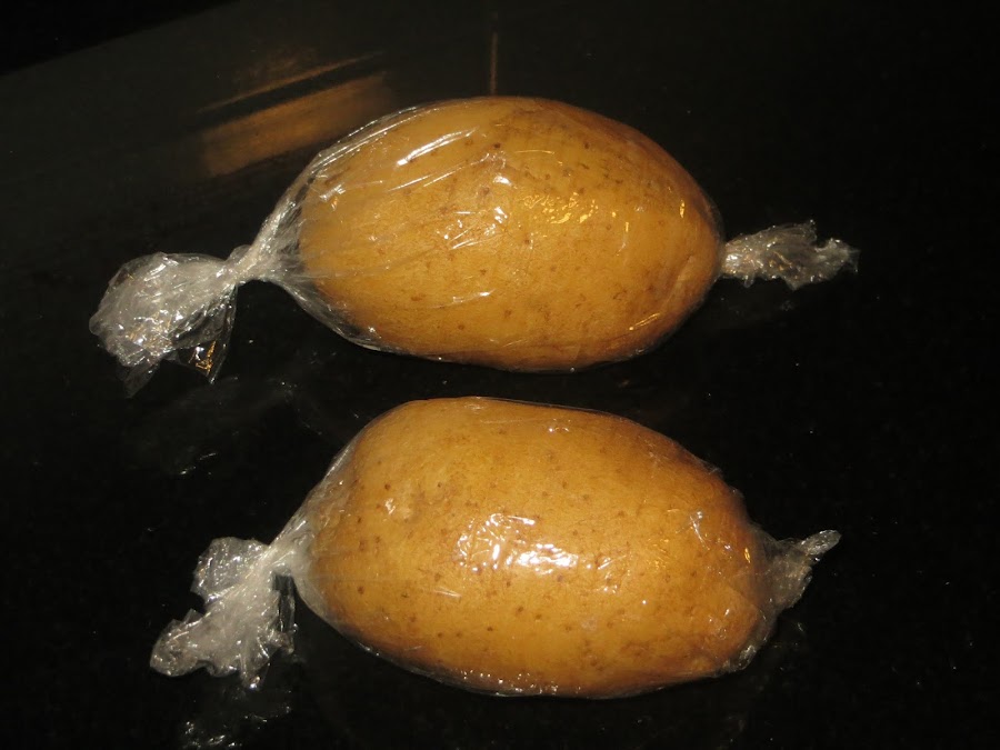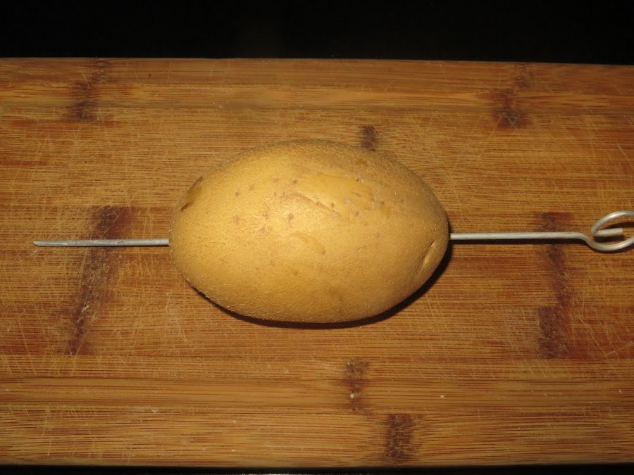 Cogemos y en la base de las patatas le colocamos un pincho para brocheta, las colocamos de pie y las vamos cortando hasta llegar al pincho en rodajas finas de unos cuantos milímetros, al tener el pincho evitamos cortarlas del todo y las dejamos tipo libro. Las envolvemos en papel film como si fueran un caramelo, les hacemos unos cuantos cortes para que el papel no se hinche en el microondas y las metemos 12 minutos a máxima potencia, lo que supone seis minutos por cada patata.
