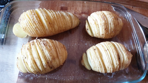 Las patatas Hasselback son patatas asadas en el horno a las que se les han hecho unos cortes y se les ha añadido mantequilla y otros condimentos. Una receta muy fácil para servir como guarnición. Yo además le he añadido bacon en cada uno de los cortes, lo que le da a la patata un extra de sabor y olor.