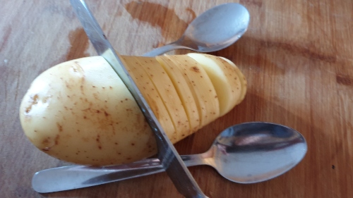 Para hacer los cortes sin cortarlas totalmente, puedes poner la patata sobre una cuchara de su tamaño o unos palillos chinos, de modo que no llegues hasta la base de la patata con el cuchillo. Haz cortes a lo largo de toda la patata.