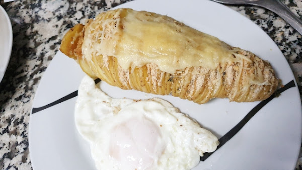 Puedes preparar otras variantes de estas patatas. Las tradicionales se sirven regadas en aceite de oliva y pan rallado, y alguna especia como tomillo, y no se les pone queso. Pero, puedes elegir ponerle mozzarella y tomate en cada corte, o queso Cheddar, o jamón o jamon york y queso, o. imaginación al poder.