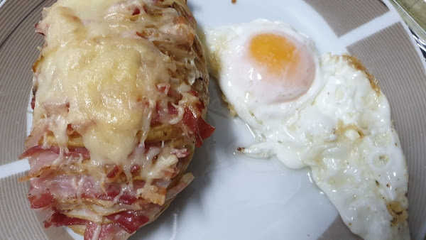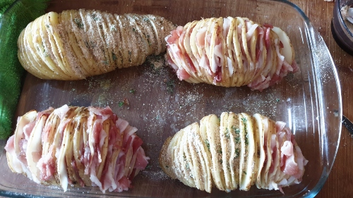 - Opción 1: Añade trocitos de bacon en cada una de las rajas de la patata