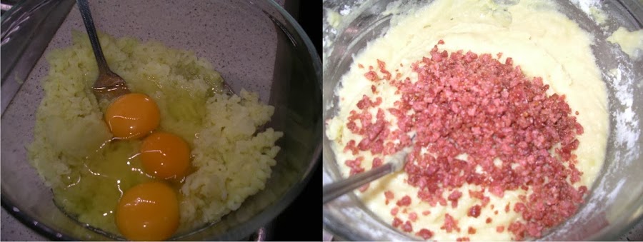 En un bol ponemos las patatas pasadas por el pasapures. Añadimos los tres huevos, la longaniza y la sal. Mezclamos todo bien. Nos quedara una pasta semiliquida.