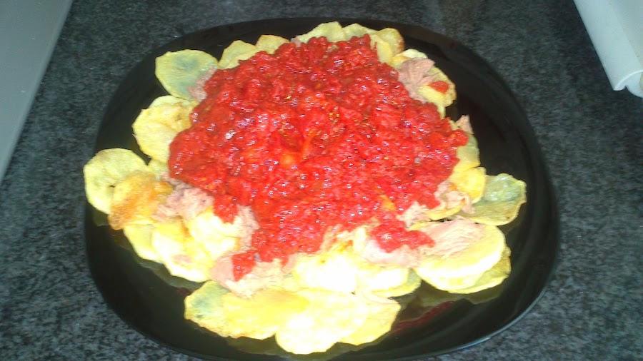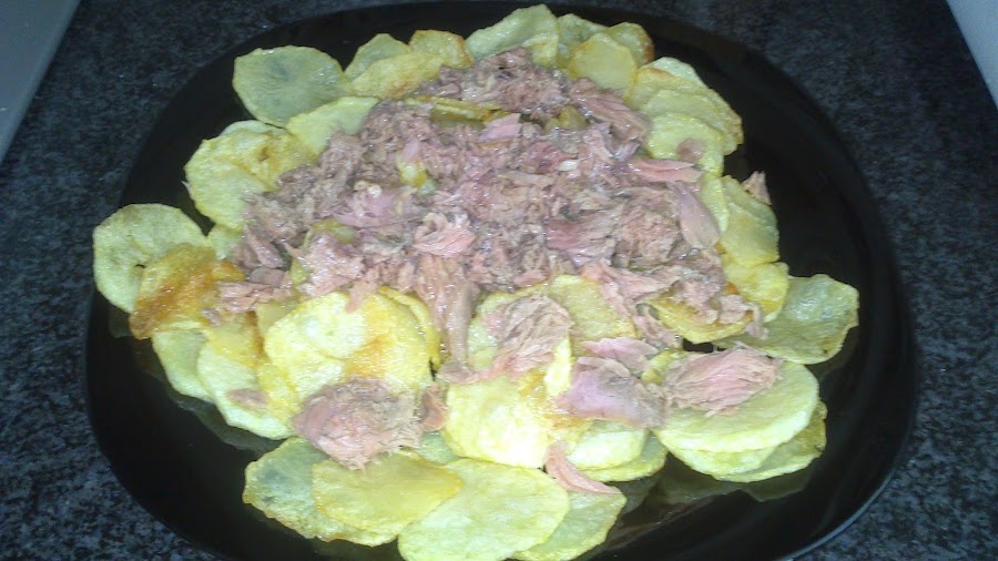 Una vez fritas las ponemos en una fuente o plato grande, según la cantidad, le ponemos por encima el bonito y cubrimos con el tomate.