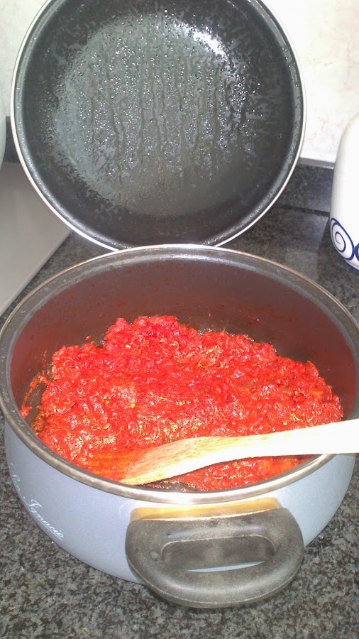 Con un poquito de aceite en una cazuela freímos el tomate, yo prefiero en cazuela a sarten por que son mas altas y no ensucia el tomate todo, poniendo la tapa un poco torcida para que respire.