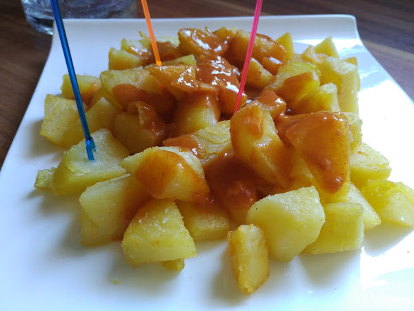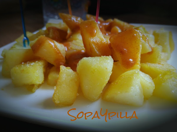 Estas patatas sí que son bravas...preparad una cerveza bien fresquita, y una sangría para mí...poruq están muuuuy bravas!! Si no os gusta mucho el picante, no le pongáis el chile, o reducid la cantidad de pimentón picante...pero están ummmm muy ricas!!