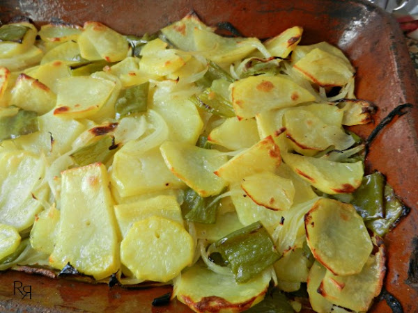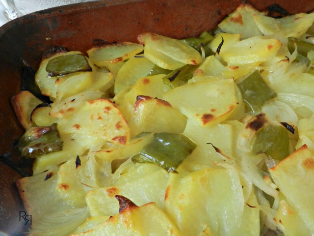 Las patatas panadera son la guarnición ideal para acompañar tanto carnes como pescados al horno. Es una receta tradicional y en cada casa se le da su puntito, yo me baso en las que preparan en el Mesón de Cándido (mesonero mayor de Castilla) aunque a mi me gusta añadirle un poco de pimiento verde; para que queden tiernas hay que poner bastante aceite y luego le quitamos el sobrante para usarlo en otros platos.