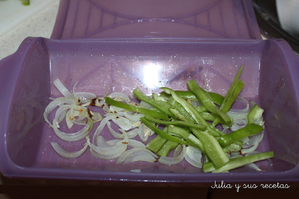 En un recipiente apto para microondas, yo he usado el papillotte, ponemos la cebolla picada con un poquito de sal, la cocemos 2 minutos al máximo de potencia (1000w). Sacamos el recipiente y ponemos los pimientos encima , un chorrito de aceite y sal y los cocemos 3 minutos al máximo (1000w).