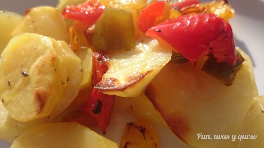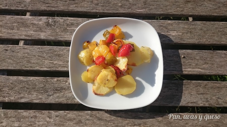 En una fuente apta para el horno colocamos las patatas y los pimientos. Salamos y espolvoreamos con tomillo.