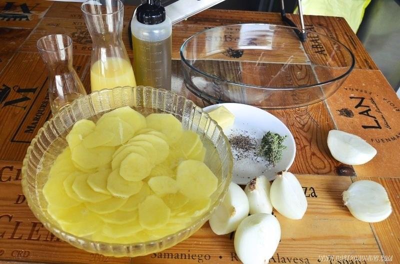 2. Pelamos las patatas y las cortamos en finas rodajas de ente 3-5 milímetros de grosor con ayuda de una mandolina o un cuchillo bien afilado y dejamos escurriendo.