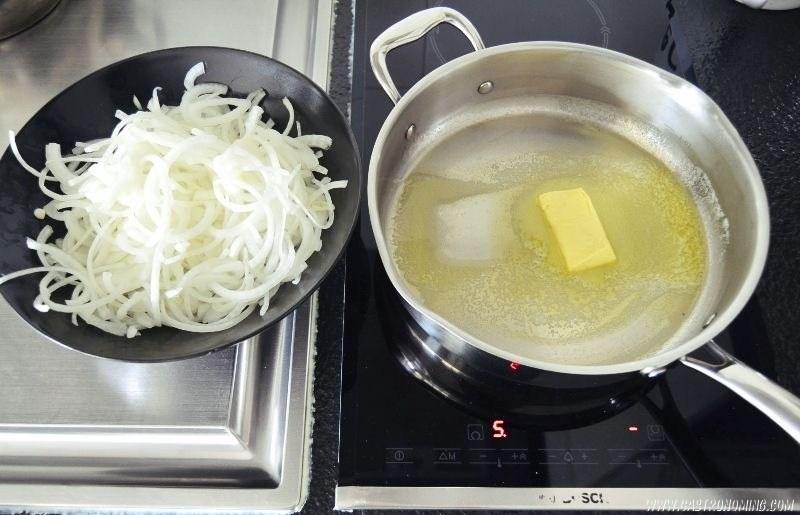 5. En una sauté o sartén amplia a fuego medio colocamos la mantequilla y sofreimos las cebollas moviendo constantemente hasta que transparenten y cojan un poquito de color, unos 15 minutos.