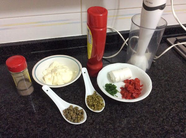 a) Ponemos la mayonesa, las 2 cucharadas de ketchup y el trozo de queso en un vaso batidor, batimos a máxima potencia hasta conseguir una mezcla uniforme.