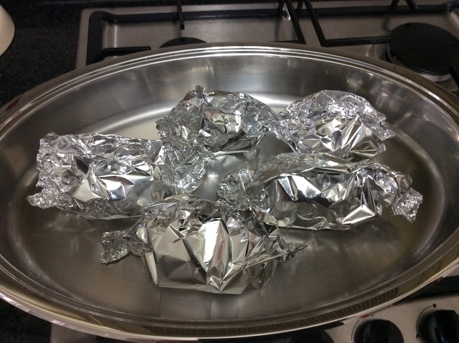 · Ponemos la patata encima del papel de aluminio y le ponemos por encima un poco de sal y unas gotas de aceite; a continuación doblamos el papel por la mitad envolviendo la patata y dejamos una pequeña cámara de aire por encima de la patata, doblamos cerrando por los extremos y ponemos en la olla oval.