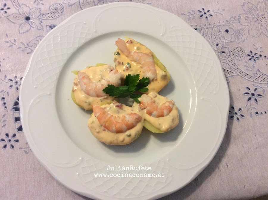 Para montar el plato, colocamos los trozos o mitades de patata, le ponemos una cucharada de salsa cubriendo la superficie y vamos a pelar unos langostinos cocidos para acompañar las patatas con la salsa.