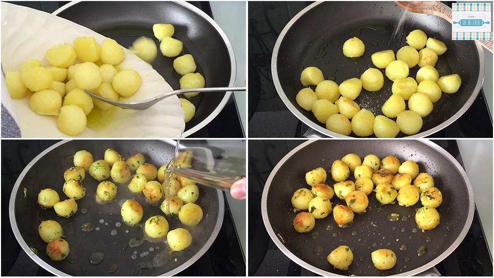 En una sartén ponemos un chorrito de aceite de oliva y cuando esté caliente incorporamos todas las bolitas de patata. Las dejamos a fuego medio hasta que se hagan por todos los lados. Tardarán aproximadamente unos 10 minutos dependiendo de la fuerza de vuestro fuego.