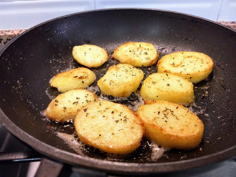 Cortáis las patatas en medallones gruesos (podéis dejarle la piel si queréis). Las doráis en una sartén con mantequilla. Un momento antes que las vayais a sacar ponéis sal y las hierbas.