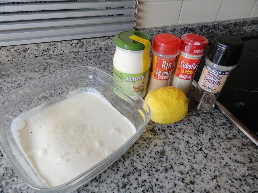 Para preparar la salsa mezclamos la nata (crema de leche) con el zumo de limón, se volverá más espesita, como cortada, pero esto es normal. Mezclamos bien y agregamos el resto de ingredientes de la salsa. Dejamos reposar en el frigorífico.