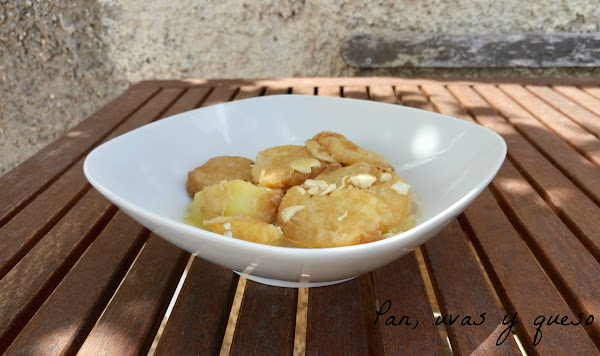 A medida que las vayamos friendo, las pasamos a una cacerola. En el mortero hacemos un majado con los dientes de ajo pelados y las almendras que desleímos con el vino blanco. Echamos el majado sobre las patatas, las cubrimos con agua y cocinamos hasta que estén tiernas.