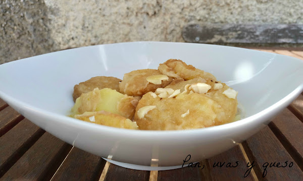 Estas patatas rebozadas son muy parecidas a mis queridas patatas a la importancia. La diferencia entre las dos recetas es el tipo de salsa que llevan, pues estas patatas rebozadas llevan un majado de almendras y ajo delicioso.