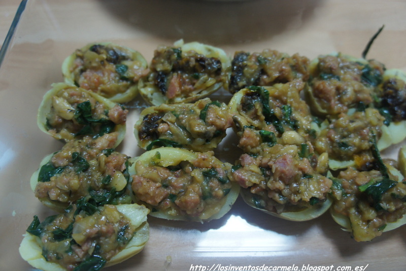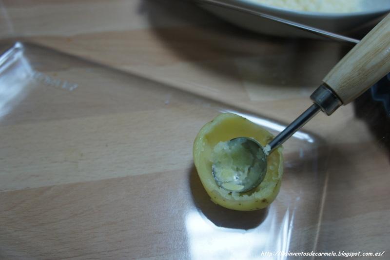 2) Sacar las patatas, partirlas por la mitad y con la ayuda de un saca bolas hacer un hueco en el medio, ir colocándolasen una fuente de horno y reservar la patata que hemos sacado de los huecos al vaciar.