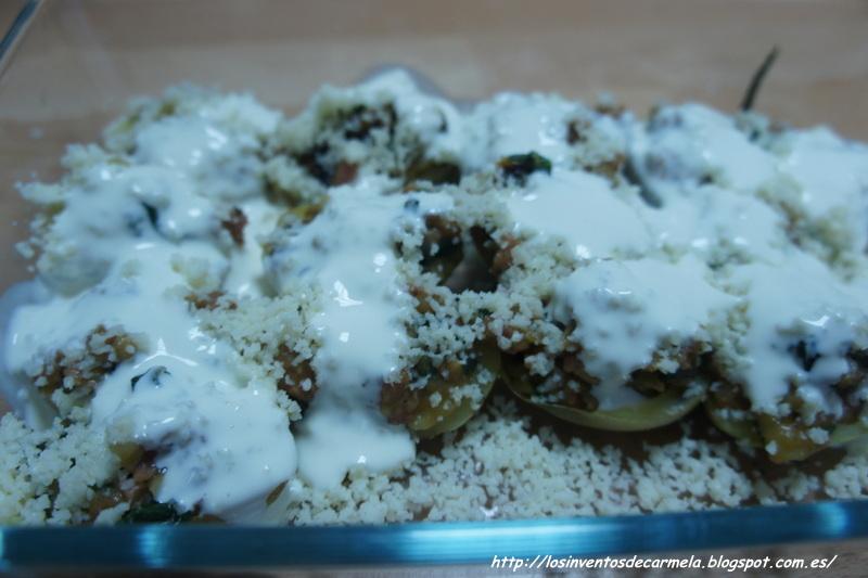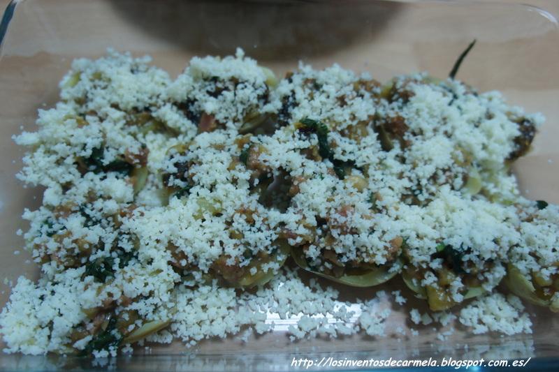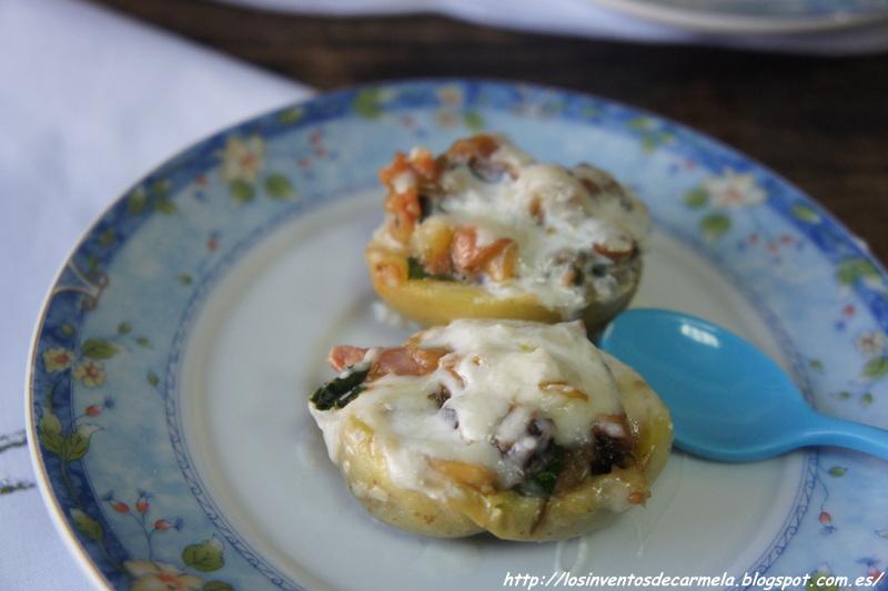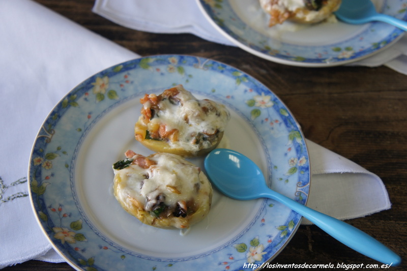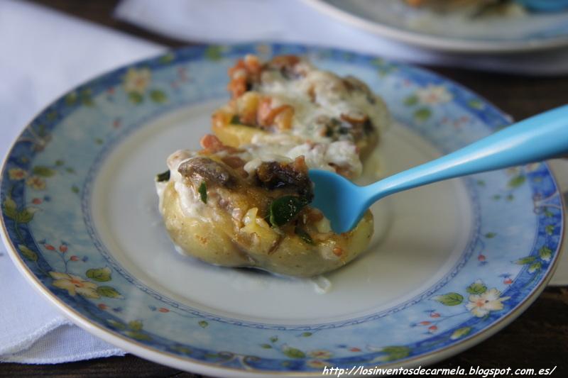 7) Rellenar las patatas con esta mezcla y espolvorear con el queso rallado y un poquito de nata (crema de leche). En el momento de servir metemos en el horno a 180º unos 10 minutos y después gratinar 5 minutos.