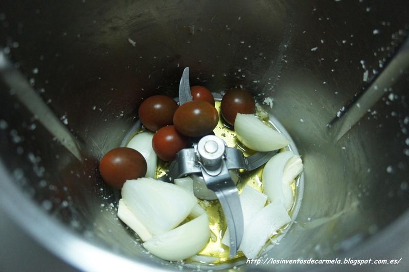4) Echar aceite en el vaso, el ajo, cebolla y los tomates cherry troceamos 4 segundos, velocidad 4 y sofreir 5 minutos, temperatura varoma, velocidad 1.
