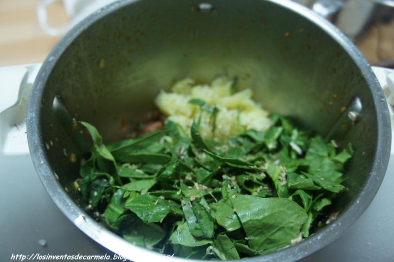6) Incorporar los trozos de patata,champiñon,acelgas,romero,tomillo y orégano 6 minutos,temperatura 100º, giro a la izquierda, velocidad cuchara.