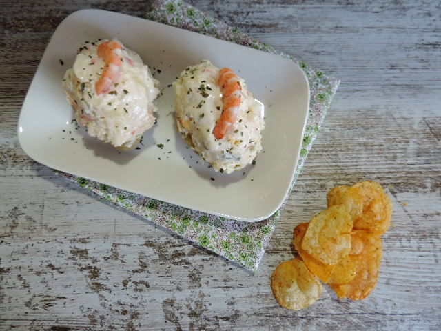 Cubrimos con una ligera capa de mayonesa y decoramos con langostinos y perejil picado.