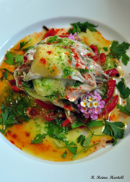 Sobre la base del plato colocamos el aliño de Pimientos, que esté lo más escurrido posible, con sabor y jugoso pero sin jugo.