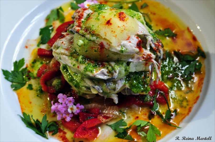 Vamos colocando rodajas sobre los Pimientos y cubriendo con los lomos marinados de las anchoas, así sucesivamente hasta terminar la Patata.