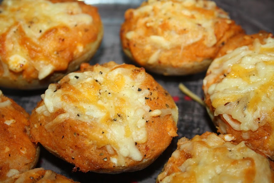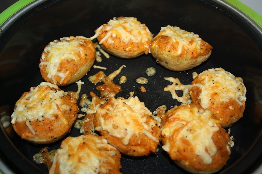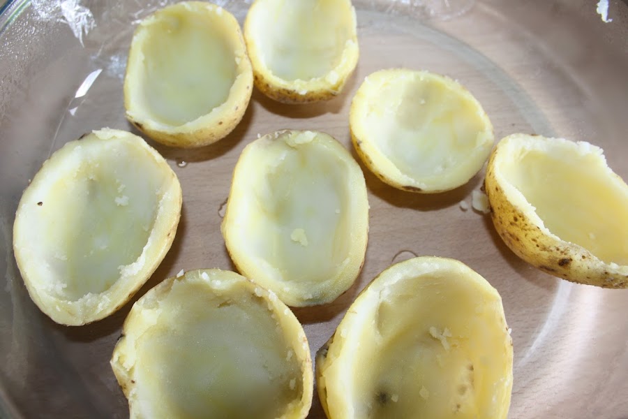 Procedemos a rellenar las patatas con una cucharita y cubrimos con queso.