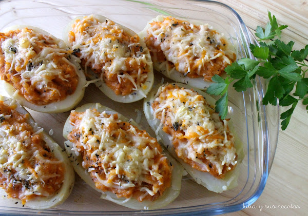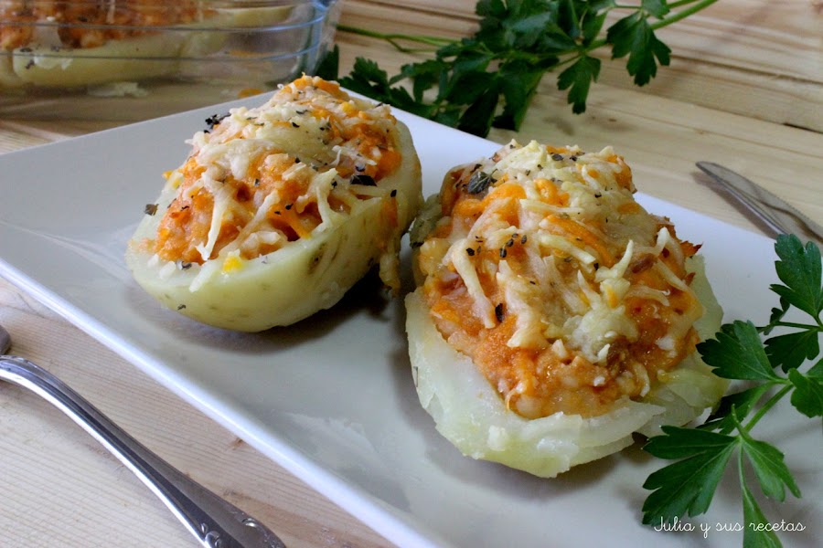 Hoy vamos a comer patatas rellenas de atún. Estas patatas son ideales para un entrante o para un plato fuerte acompañadas de una buena ensalada.