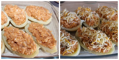 Rellenamos las patatas, las colocamos en una bandeja de horno. les ponemos el queso rallado por encima y el orégano y las metemos a gratinar unos 10 minutos a 180º.