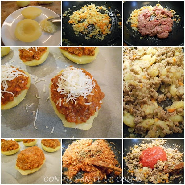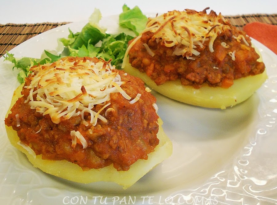 A todo ésto, he hecho unas patatas rellenas de una salsa parecida a la boloñesa que me han quedado estupendas. He dicho parecida porque la boloñesa lleva mucho tiempo de cocción, pero ésta que se hace muy rápida, también queda muy rica. Si quieres ver la boloñesa de verdad pincha aquí y si quieres ver mis patatas, pues sigue leyendo, no?