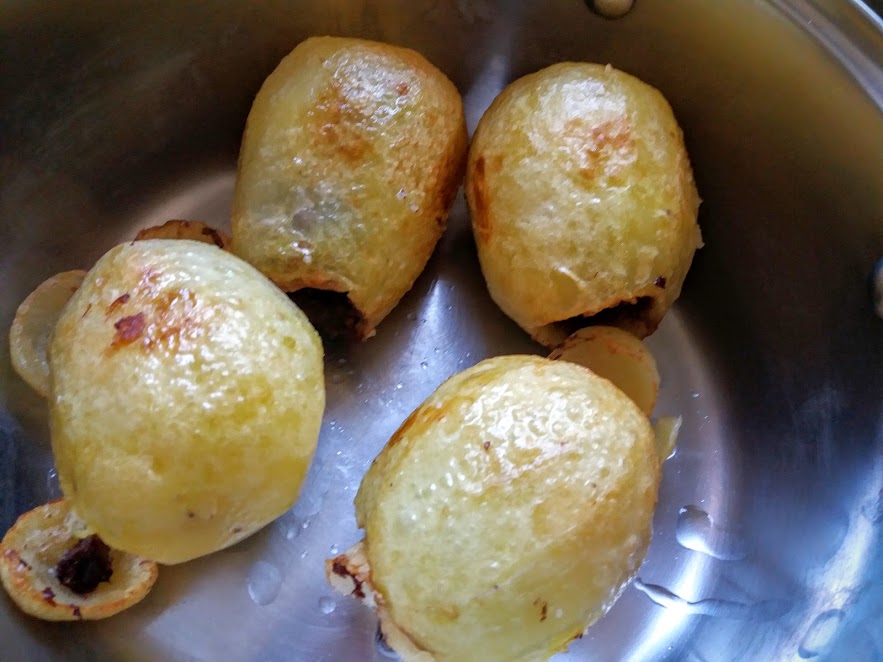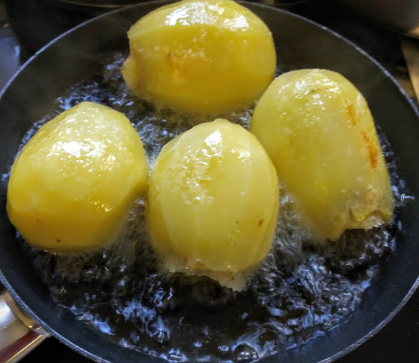 Ponemos aceite en una sartén y freímos las hasta que estén doradas, pasamos a una olla,también freímos los trozos que sacamos de la parte de dentro.