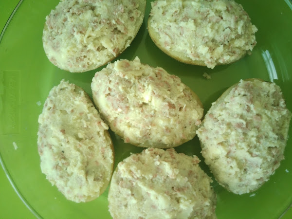 Procedemos a vaciar las patatas. En un bol, mezclamos la patata con el resto de ingredientes, a excepción del queso en polvo. Salpimentamos al gusto.