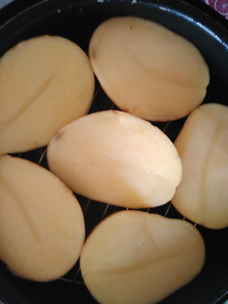 Las colocamos en la cubeta de la cecofry, con la rejilla en posición baja. Programamos 10 min, girándolas a mitad de tiempo para que se doren por igual.