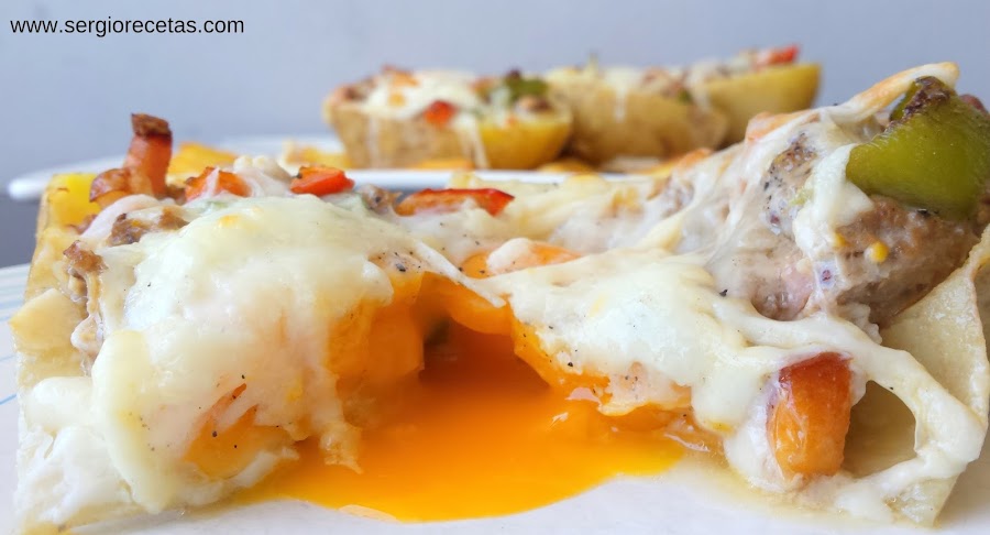 Colocamos las barquitas de patata sobre una fuente para el horno y las sazonamos, las rellenamos con la carne que teníamos aliñada, le hacemos un hueco en el centro de la carne para alojar el huevo que pondremos en él, ponemos bien de queso mozzarella sobre cada una de las patatas y espolvoreamos con el orégano. Horneamos unos 15 minutos a la temperatura marcada hasta que el queso se haya fundido y el huevo no este crudo.