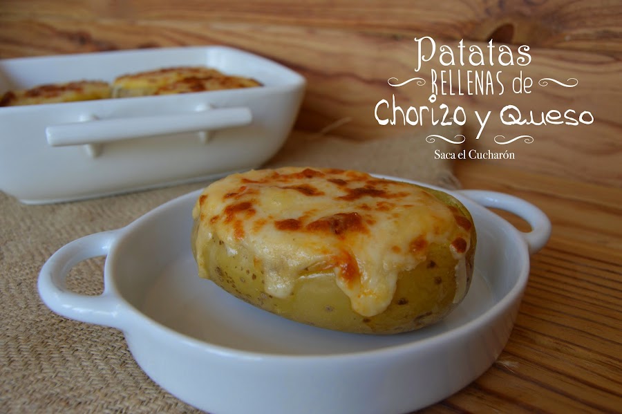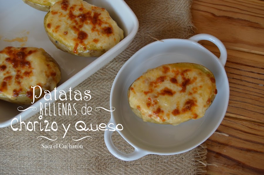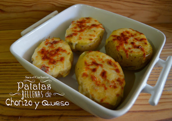 Rellenamos cada patata con esta mezcla y por encima les echamos un poco de queso rallado del que habíamos reservado. Metemos las patatas en una bandeja para el horno y dejamos que se gratinen debajo del grill hasta que cojan un color dorado.