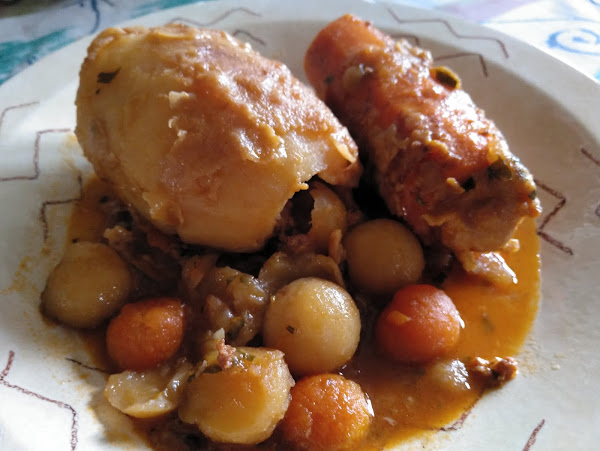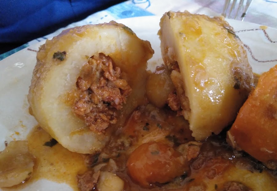 Agregar esta salsa a las patatas y se cubre todo con caldo y se deja cocer a fuego lento durante una hora a fuego lento.