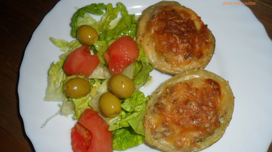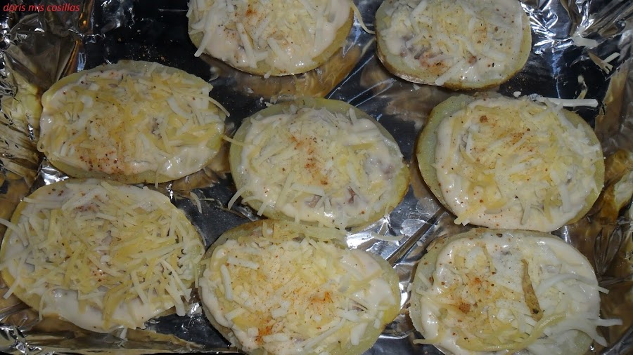 Rellenamos con esta mezcla las patatas, agregamos por encima queso rallado, ponemos en una bandeja de horno.