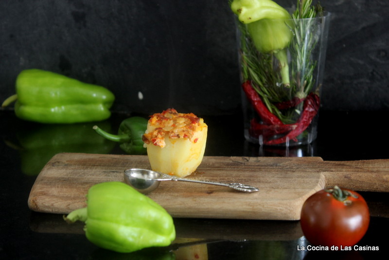 Pela, moldea las patatas, recuerda de cortar la base para que te queden de pie. Retira el interior con el sacabocados. Cuece, junto con los sobrantes (puedes guardarlo para un buen puré de patata), en una tartera hasta que estén cocidas Pica la Ropa Vieja, incorpora los pimientos muy picados y los huevos batidos. Dale una vuelta en sarten, intenta que cuaje muy poco el huevo. Rellena cada patata con la farsa.
