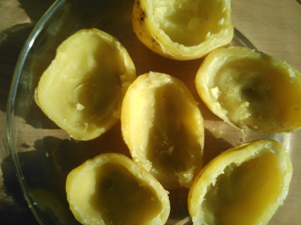 Cuando tengamos listas las patatas, dejamos atemperar unos minutos. Procedemos a vaciarlas con cuidado de que no se rompan. Chafamos la patata extraída y la mezclamos con la mostaza y las salchichas y bacon. Salpimentamos al gusto, y pulverizamos ligeramente con aceite. Removemos bien.