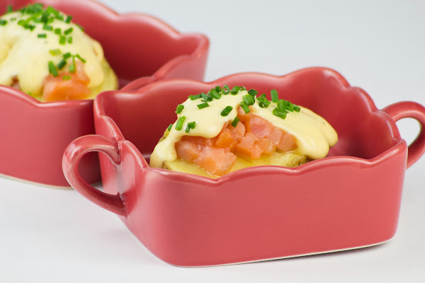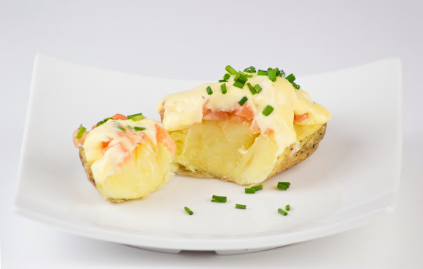 Cortar las patatas por la mitad, colocar encima unos dados de salmón ahumado, poner la salsa holandesa y terminar con un poquito de cebollino cortado en trocitos.