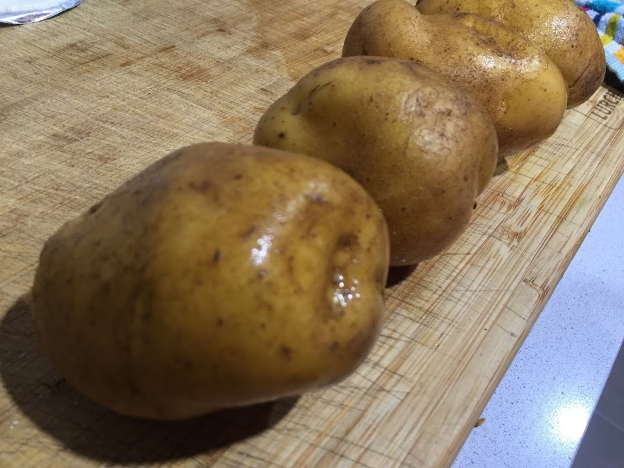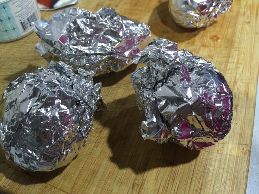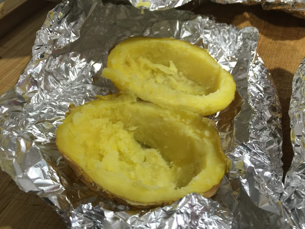 1. Precalentamos el horno a 200ºC. Lavamos bien las patatas y las cubrimos enteras con papel de aluminio. Horneamos a 200ªC durante 40 minutos. Para comprobar que están hechas introducimos un palillo en ellas y debe traspasar sin dificultad.