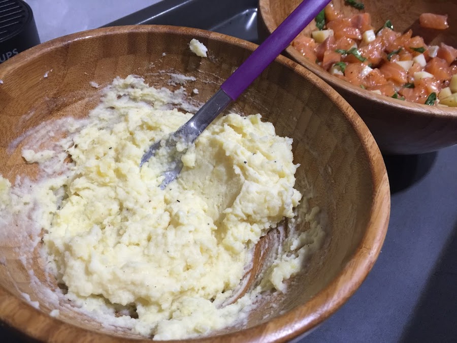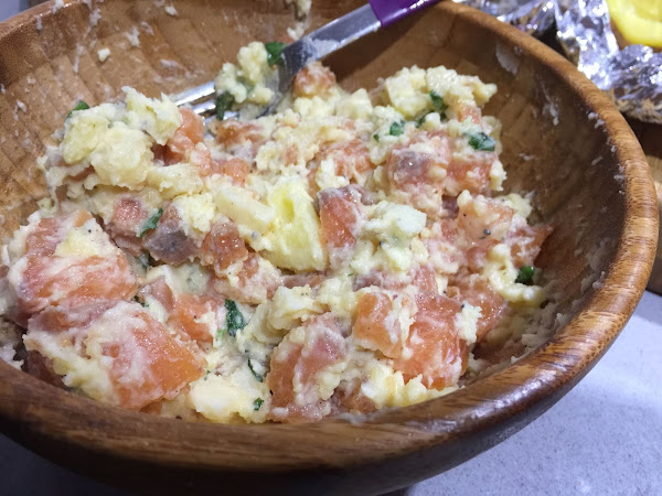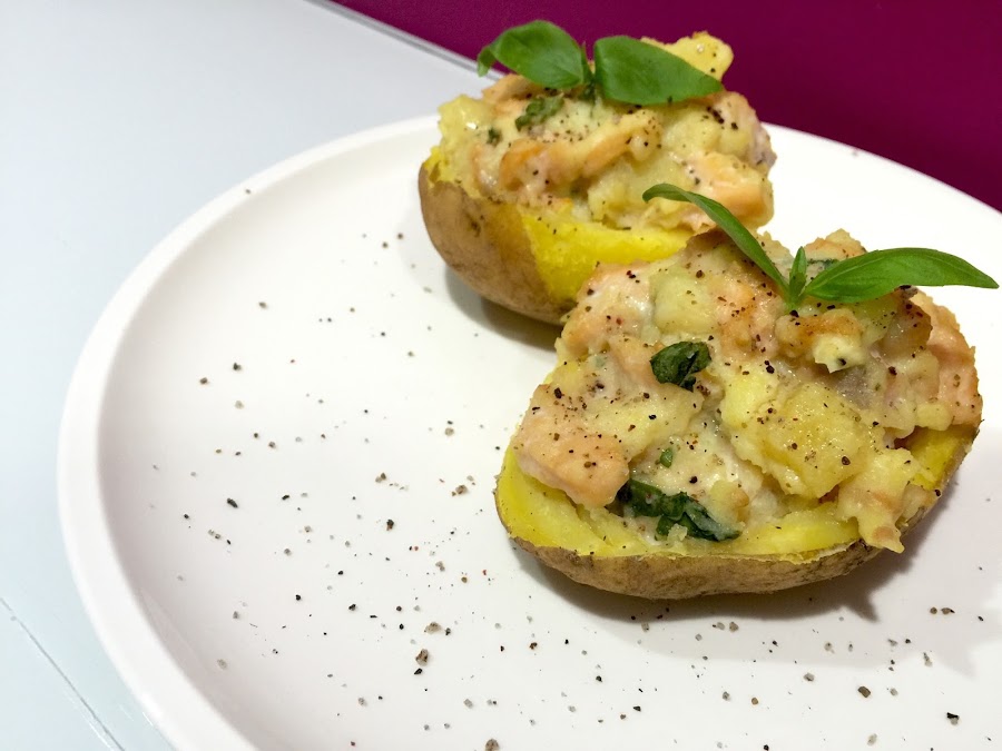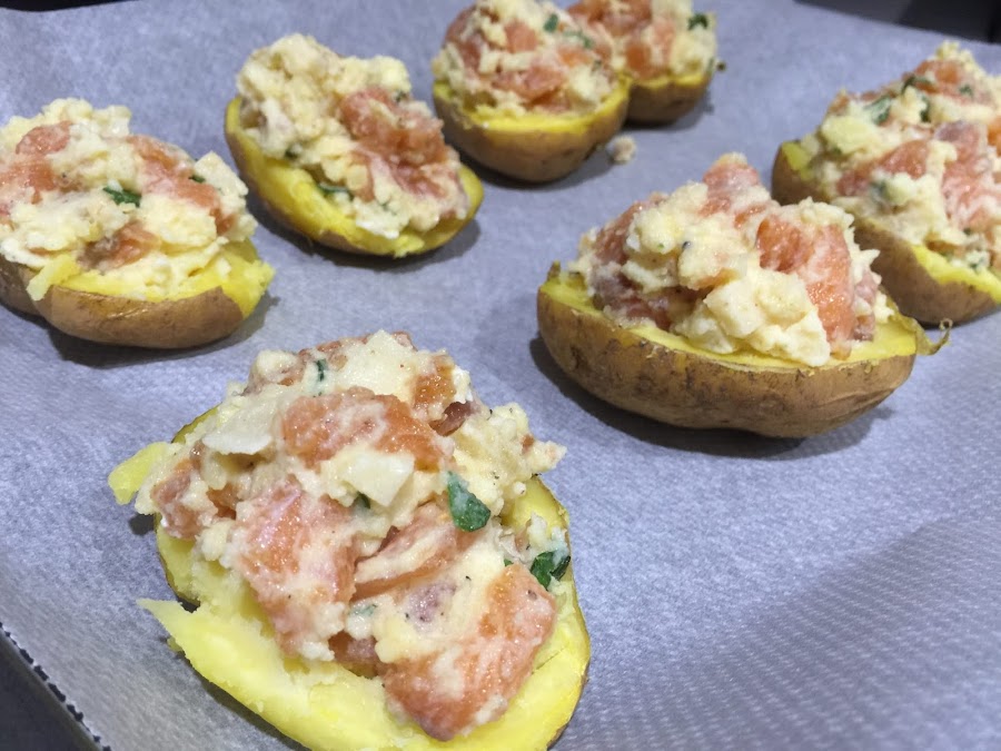 6. Añadimos el salmón que teníamos reservado en la nevera al puré de patatas. Mezclamos bien y repartimos el relleno entre las 8 medias patatas. Horneamos 10 minutos a 200ºC. No lo hagáis más porque el salmón quedaría reseco.