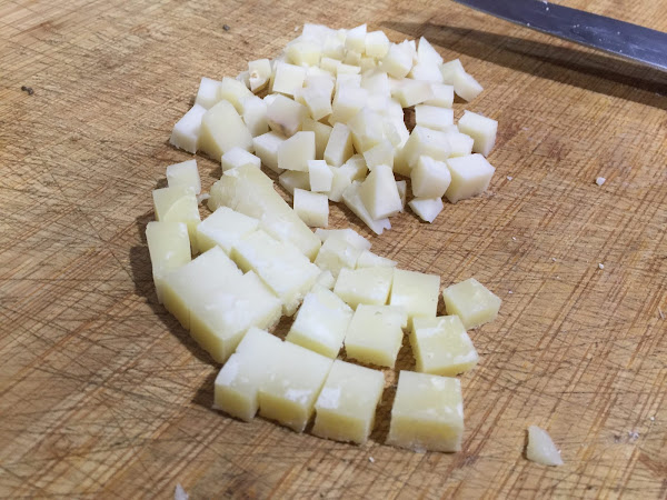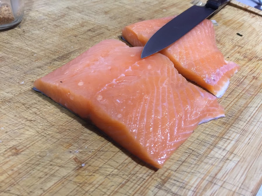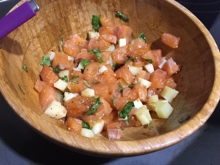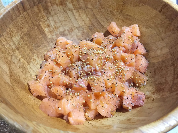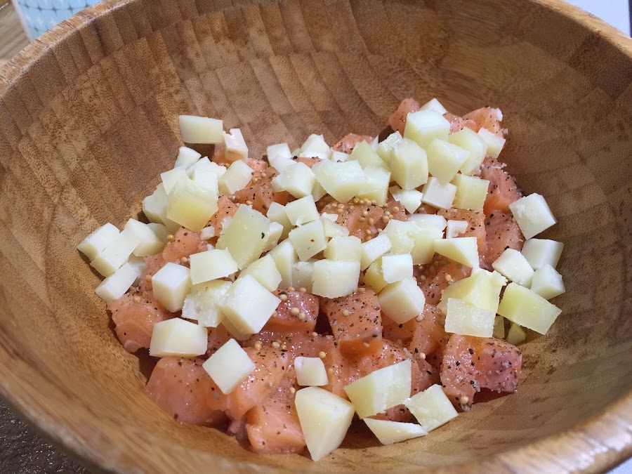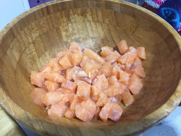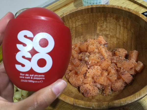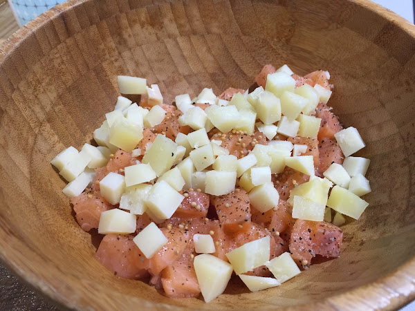 2. Mientras se hornean las patatas preparamos el relleno. Limpiamos bien los dos lomos, quitamos la piel y nos aseguramos que no quede ninguna espina. Cortamos a taquitos el salmón y los ponemos en un bol. Salpimientamos con alegría con la flor de sal picante de soso factory.