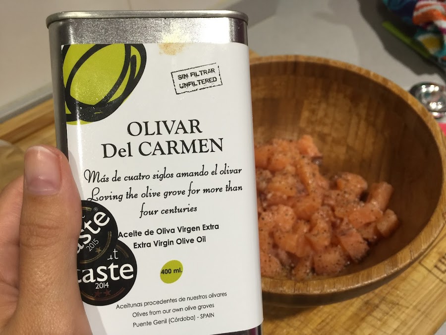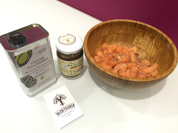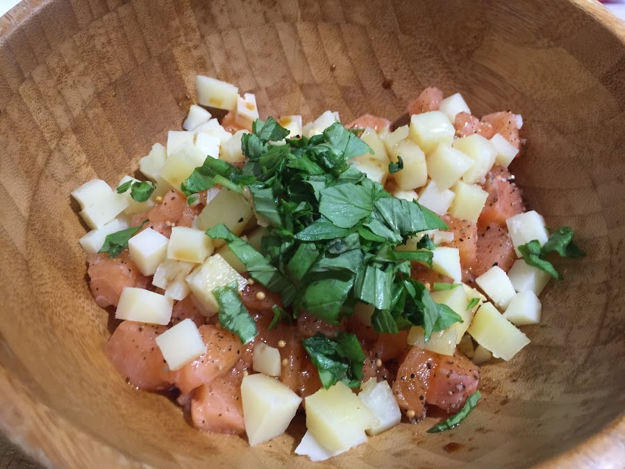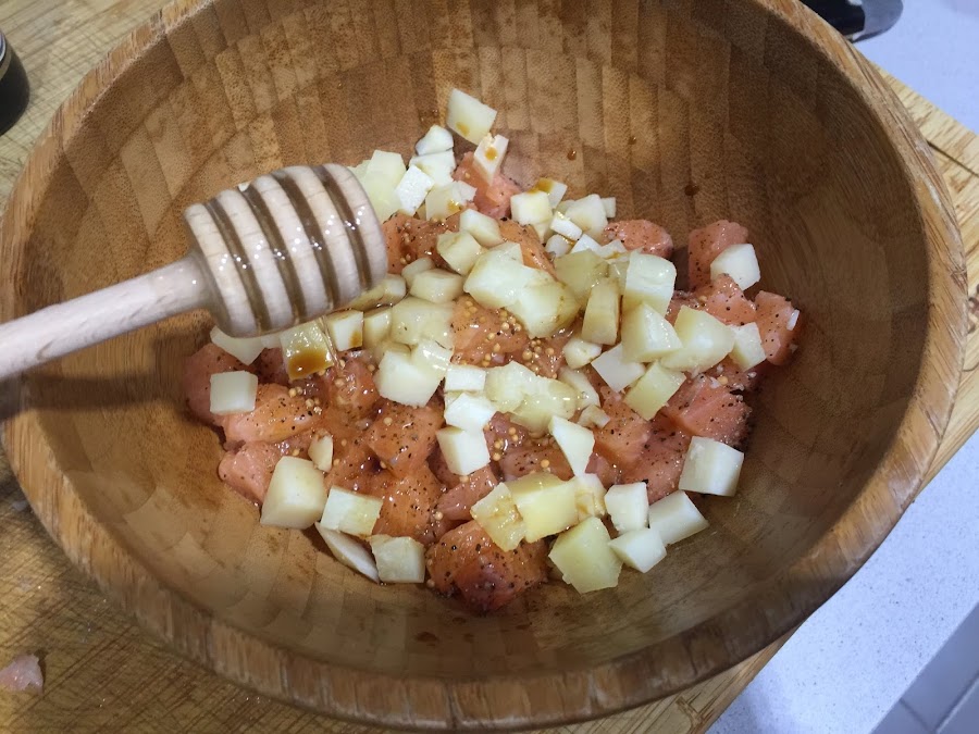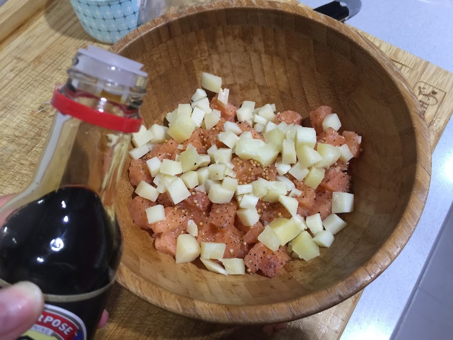 3. Agregamos 1 cucharada de aceite de oliva virgen extra y otra cucharada de miel con jengibre al salmón. Estos dos productos son de la tienda delicatessen yaentucasa, la mejor tienda de productos gourmet y de toda confianza. Agregamos también las semillas de mostaza, el queso cortado a cuadritos, la albahaca y la salsa de soja. Mezclamos bien y dejamos reposar en la nevera 20 minutos mientras las patatas terminan de hacerse.