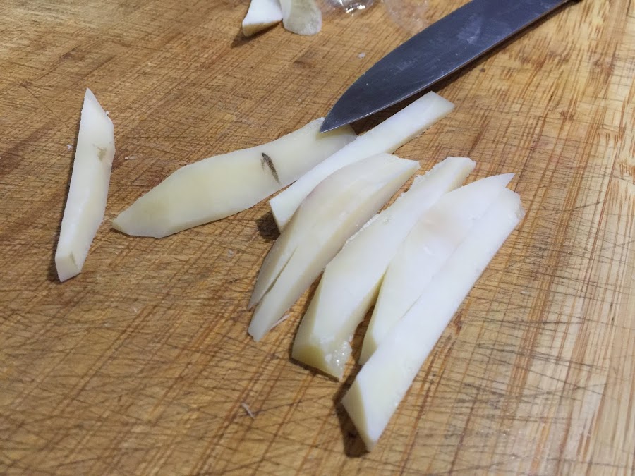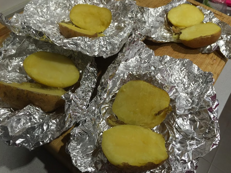 4. Sacamos las patatas del horno, con cuidado de no quemarnos retiramos el papel de plata y las partimos por la mitad. Con la ayuda de una cuchara vaciamos el interior de la patata.