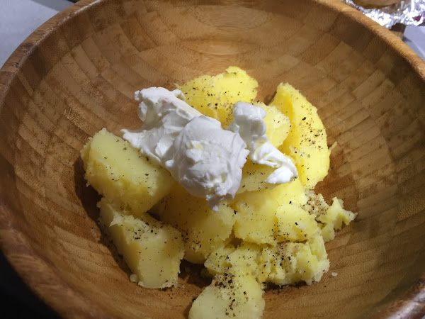 5. En un bol aparte colocamos toda la patata sobrante con el queso philadephia, la leche, la mantequilla y la flor de sal de soso factory. Con un tenedor machacamos bien la mezcla hasta obtener una textura cremosa.