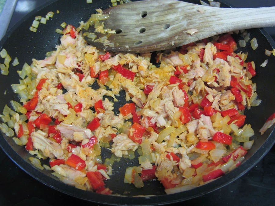 Cuando se vaya quedando el pimiento blandito y transparente la cebolla, añadimos el atún desmigado, y rehogamos durante 2-3 minutos, a fuego medio.